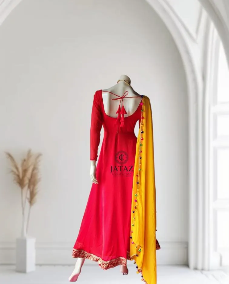 Elegant Red Gown with Yellow Dupatta – Padded with Back Zipper