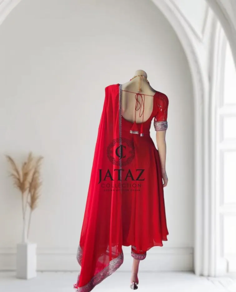 DESIGNER RED 3 PIECE UMBRELLA KURTHA SET EITH SATIN PANT AND EAUTIFUL SWAL