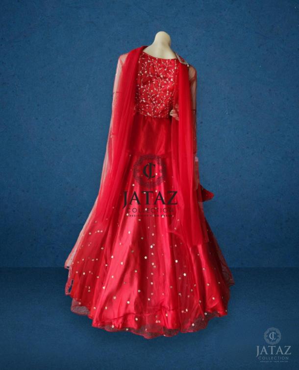 DESIGNER 3 PIECE RED NET LEHENGA SET WITH PEPLUM TOP , BEAUTIFUL SWAL, ALL OVER THREAD AND SQUENCE WORK WITH CAN CAN INSIDE