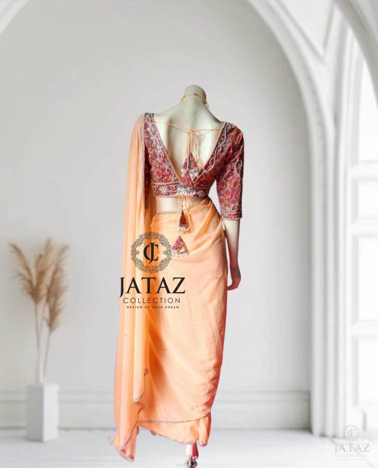 DESIGNER PEACH SAREE WITH HANDEMBROIDERY BLOUSE SET